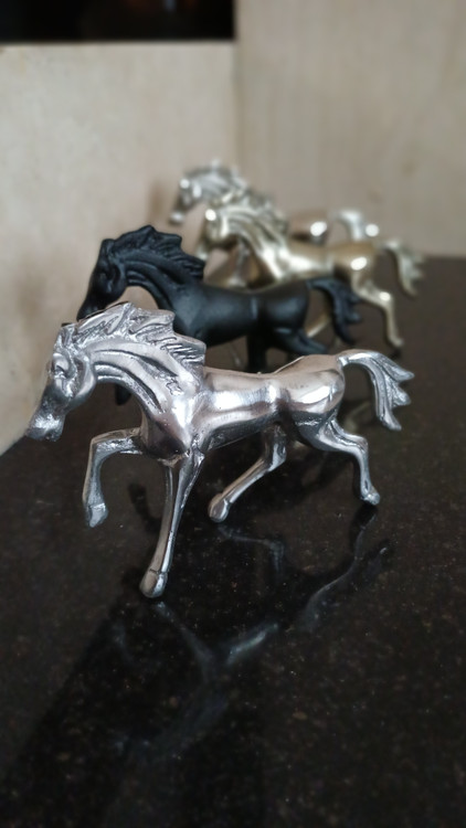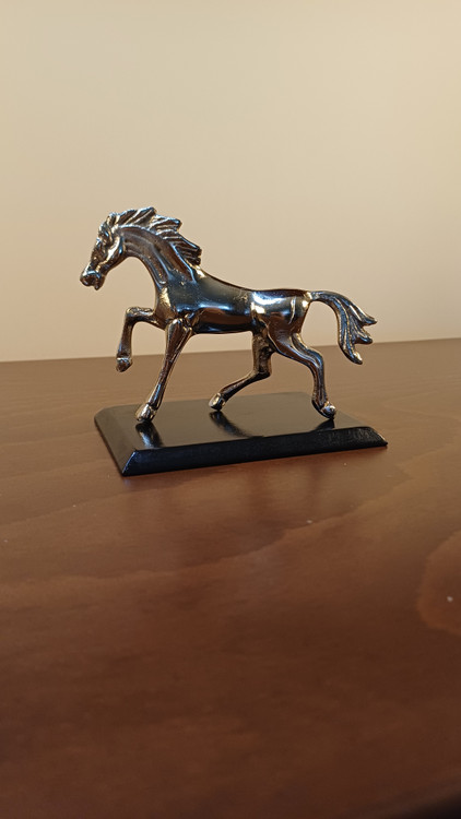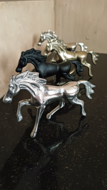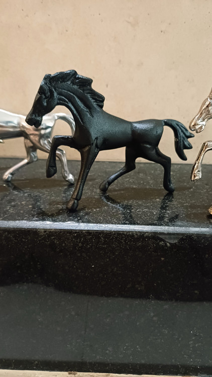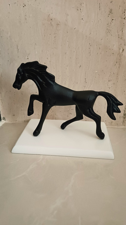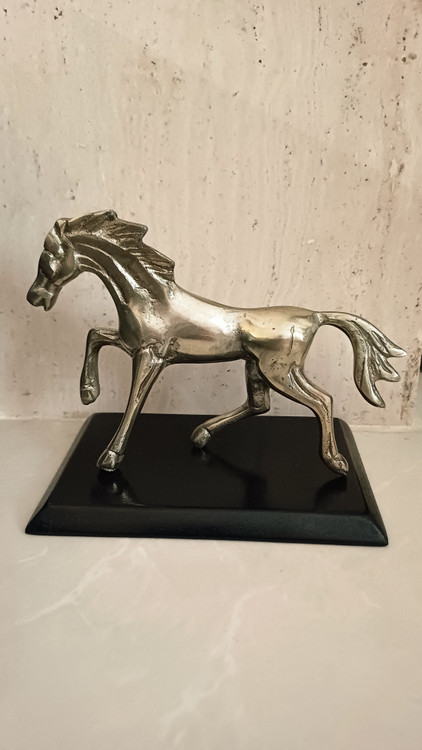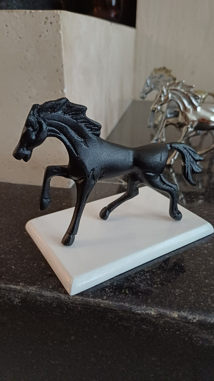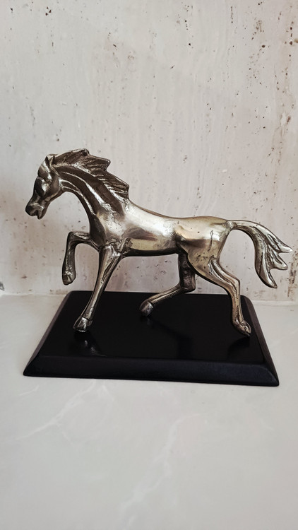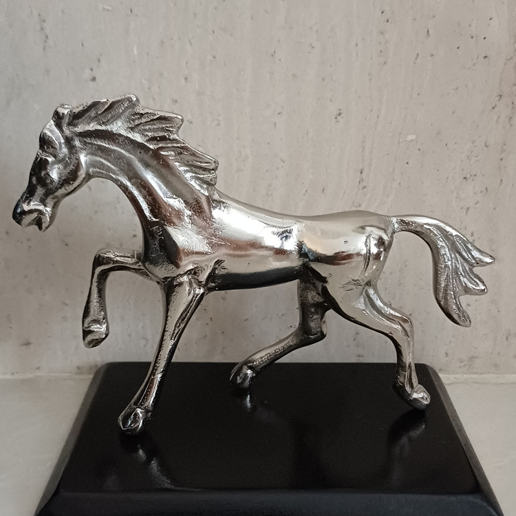 این مجسمهی آلومینیومی زیبا، تصویری از اسبی در حال گامبرداری است؛ نمادی از پویایی، قدرت و آغاز. ساختهشده از آلومینیوم ریختهگریشده با پرداخت نیمهصیقلی، روی پایهای مشکی قرار گرفته تا تضاد رنگی آن جلوهای مجلل و چشمگیر به فضا ببخشد.