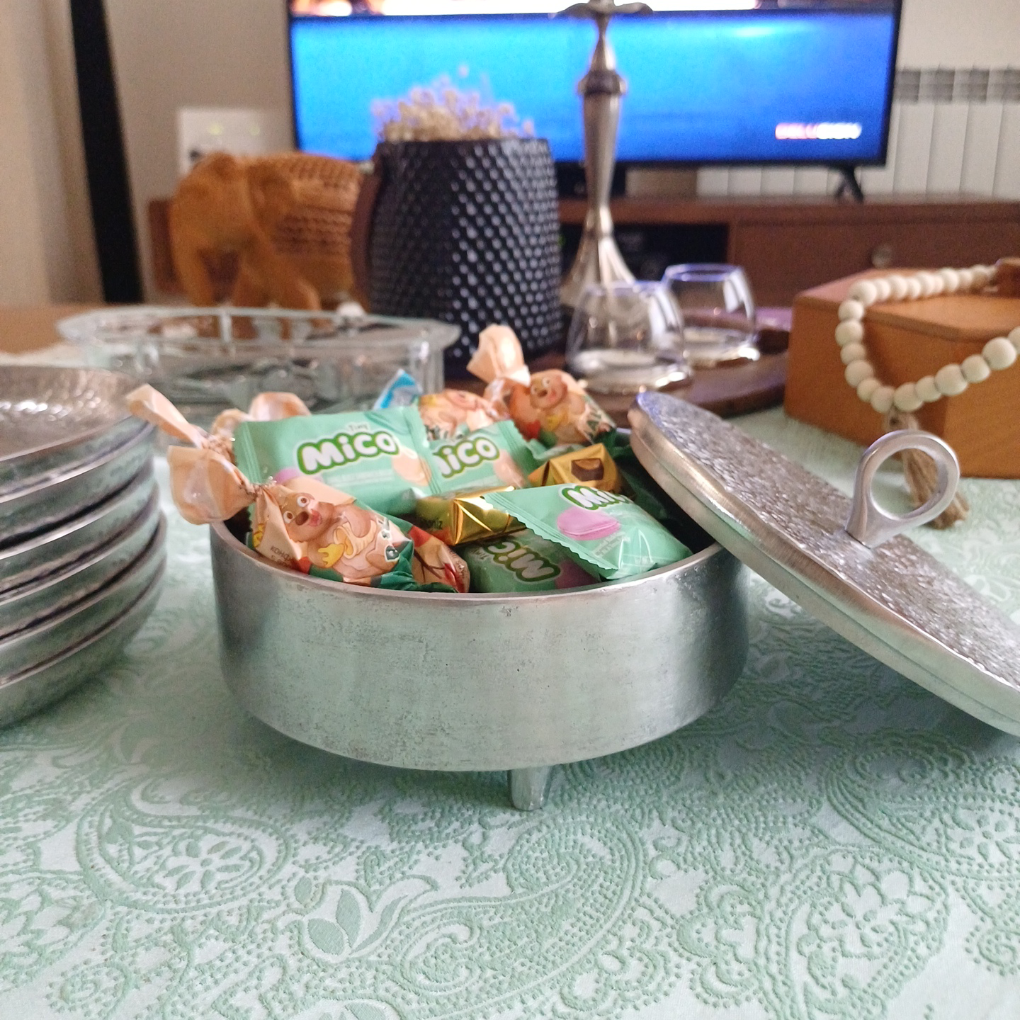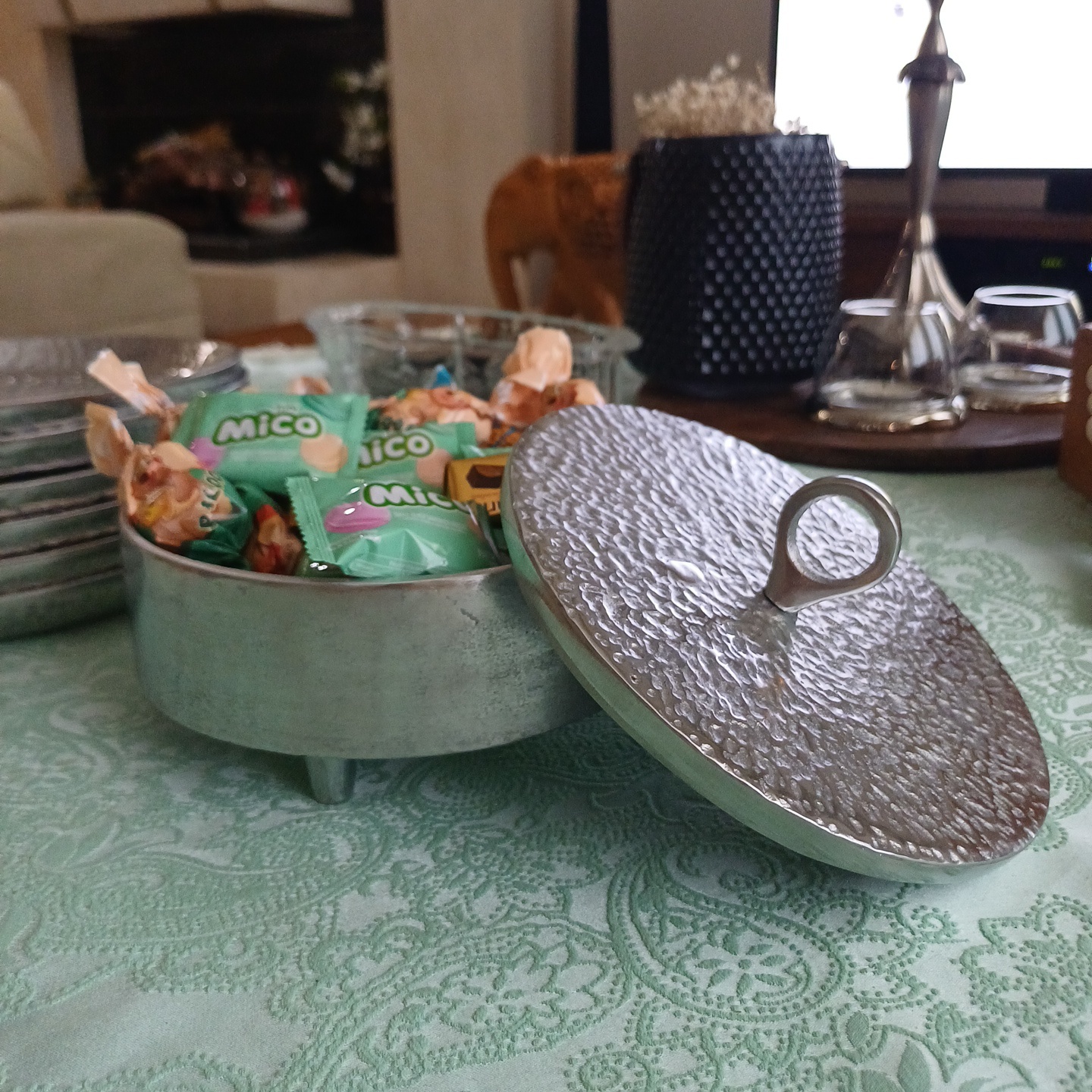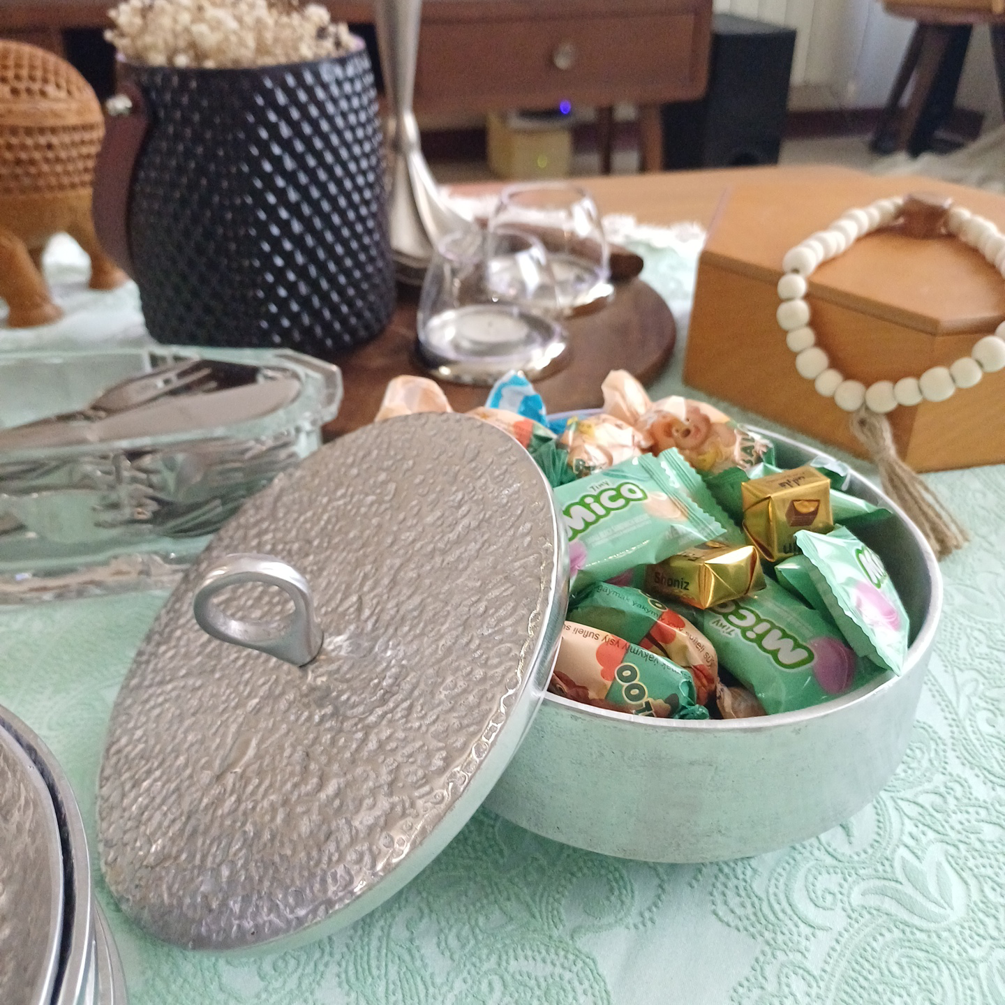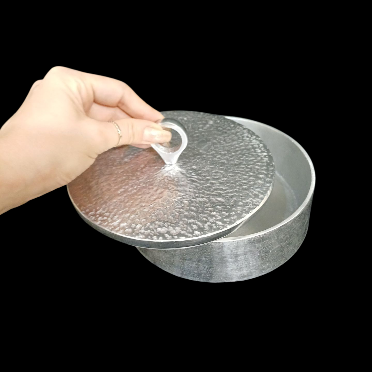 شکلات خوری آلومینیومی چکشی دربدار مدرن یک انتخاب خاص برای پذیرایی شیک و منظم است. طراحی گرد با بافت چکشی برجسته روی درب و بدنه، جلوهای لوکس و متفاوت به میز پذیرایی شما میدهد و در عین حال با درب کاربردی، از محتویات داخل ظرف محافظت میکند.