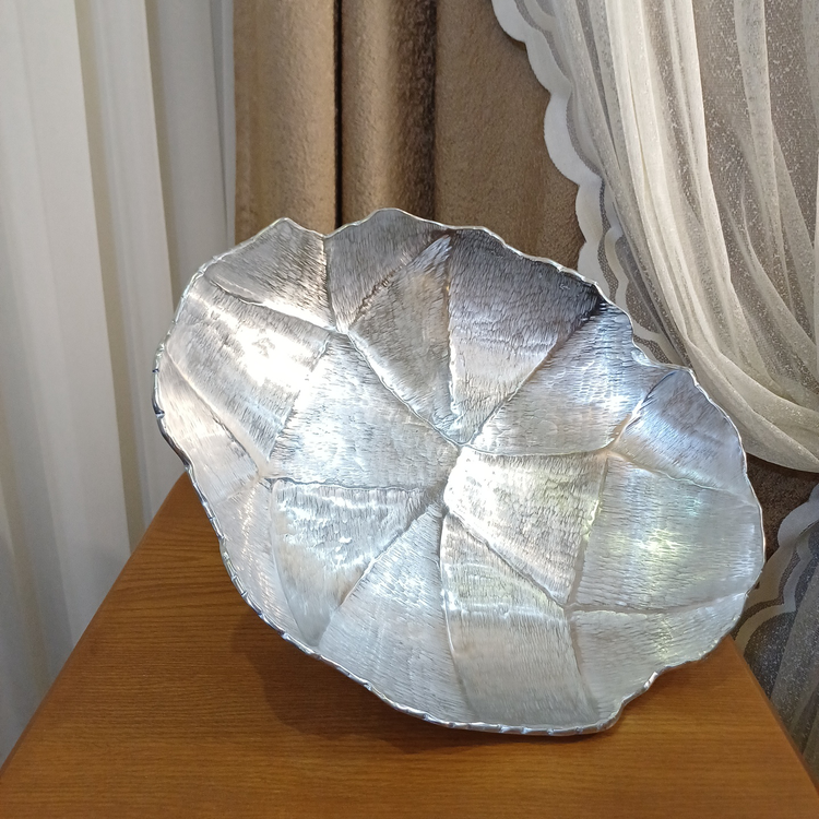 فرم بیضی این میوهخوری باعث میشود چیدمان میوهها طبیعیتر و زیباتر دیده شود. لبههای کنگرهدار در کنار خطوط منظم تراشخورده روی بدنه، بازی نور جذابی ایجاد میکند و جلوهای درخشان و مجلسی به فضا میبخشد. پایهدار بودن آن نیز ارتفاع مناسبی ایجاد میکند تا ظرف در مرکز میز جلوه بیشتری داشته باشد.